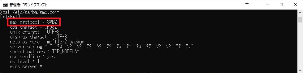 前回変更したファイル/etc/samba/smb.confの1行目に「max protocol = SMB2」を、毎回起動時に追記するように変更します。